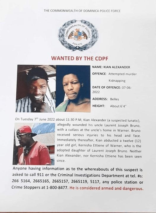 Alexander is wanted for attempted murder, and kidnapping offences, since on the night of 11:30 pm of Tuesday, June 7th, he assaulted his uncle, Laurent Joseph Bruno at his home in the village of Warner with a cutlass inflicting “serious wounds to his head and face,” before kidnapping 12-year-old, Kernisha Etienne, of the same address, and taking her with him into the surrounding bushes. Bruno, who is the child’s adopted father, was admitted to the Dominica China Friendship Hospital for medical attention.