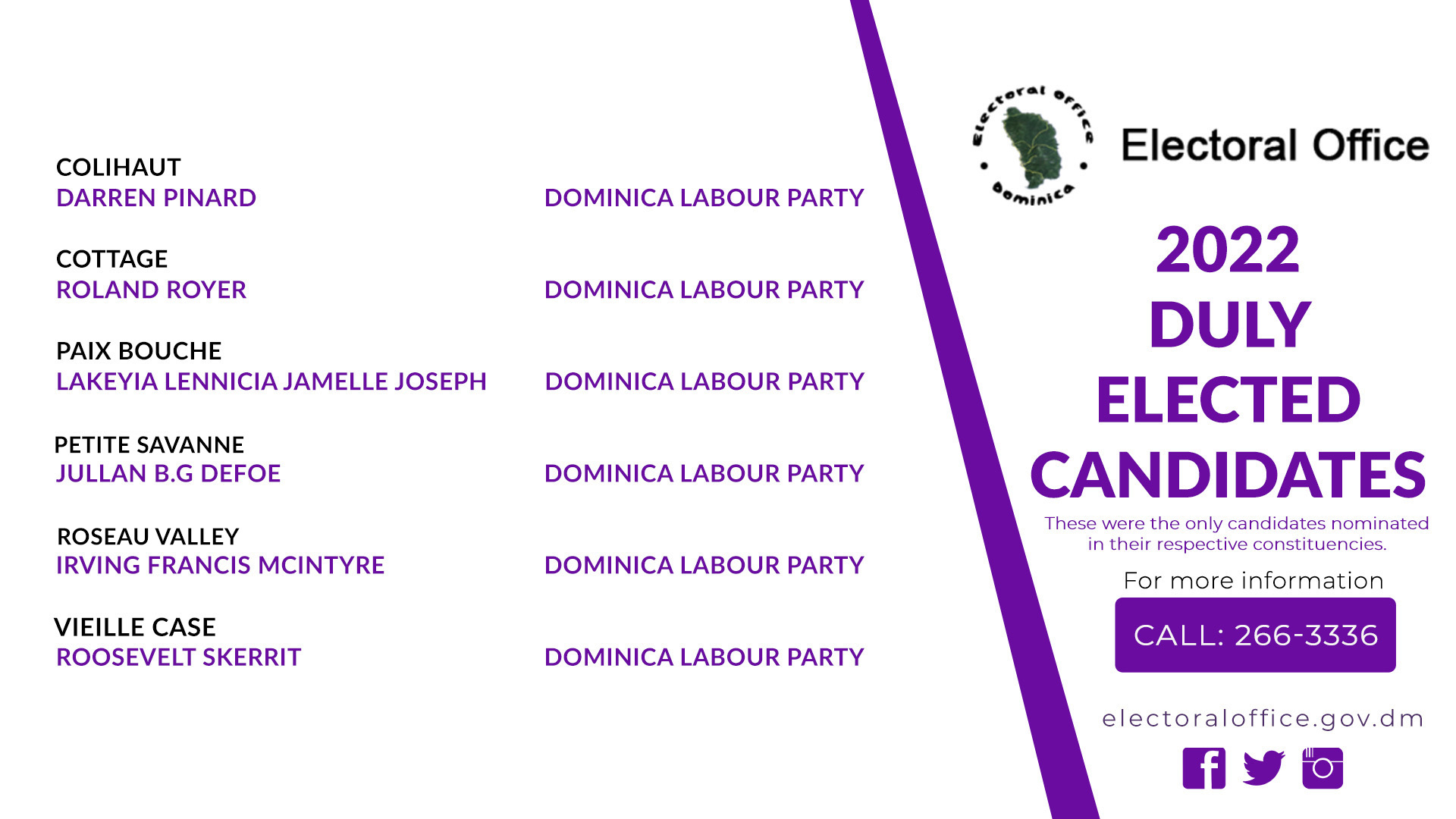 The Dominica Labour Party(DLP) nominees in 6 of the 21 constituencies have been duly elected as they were the only candidates seeking election in the constituencies of Colihaut, Cottage, Paix Bouche, Petite Savanne, Rosalie and Vielle Case. Prime minister, Roosevelt Skerrit, who has been nominated for the 6th consecutive time, has held the Vielle Case seat since 2000.